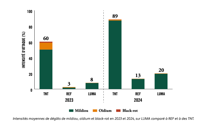 Le mildiou reste la maladie prépondérante dans le vignoble ; les Témoins Non Traités (TNT) permettent de visualiser la pression parasitaire de l’année. Les traitements apportés sur REF et LUMA permettent d’abattre efficacement la présence de maladie ; toutefois, des différences de comportement subsistent dans les parcelles.